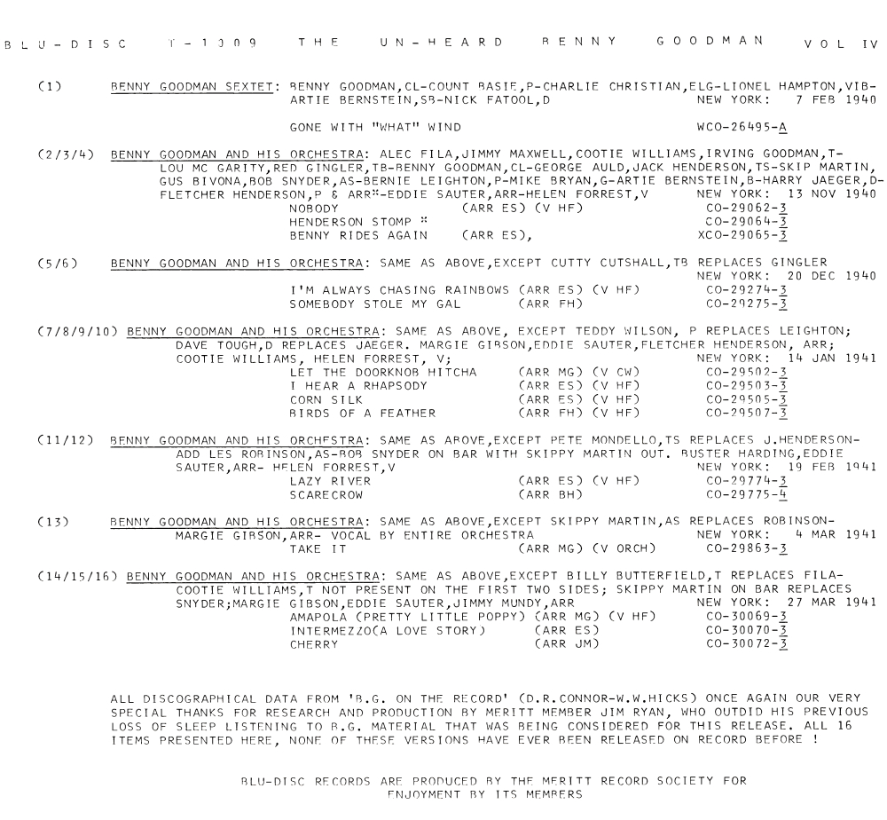 A2-B8 (collected) Benny Goodman (clt), Helen Forrest (voc); TRUMPETS: Jimmy Maxwell, Cootie Williams, Alec Fila, Irving Goodman, Billy Butterfield; TROMBONES: Lou McGarity, Cutty Cutshall, Red Gingler; REEDS: Pete Mondello, Gus Bivona, Georgie Auld, Jack Henderson, Skip Martin, Bob Snyder, Les Robinson; PIANO: Bernie Leighton, Fletcher Henderson, Teddy Wilson; GUITAR: Mike Bryan; BASS: Artie Bernstein; DRUMS: Harry Jaeger, Dave Tough.